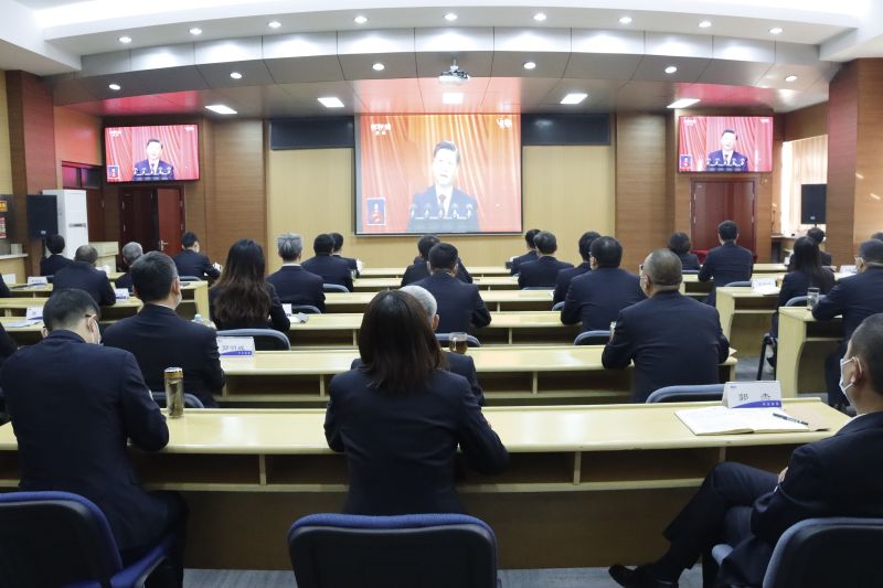 公司領(lǐng)導(dǎo)班子成員,各部門、各單位中層以上干部近50人在主會場觀看,各直屬黨支部委員、子公司黨委近50人在分會場觀看大會直播。